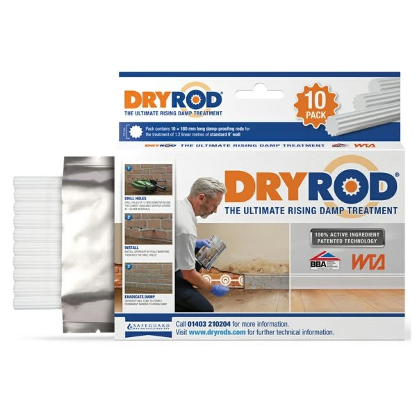 Safeguard Dryrod Damp-Proofing Rods are 12mm diameter, 180mm length, fibre rods that contain a powerful water repellent. Quick installation speed and a high level of performance making it the next generation treatment for rising damp.