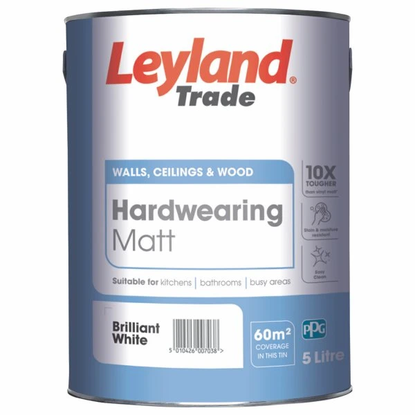 Leyland Trade Hardwearing Matt is a low VOC content matt finish. A scrubbable product which is thinned with water and is applied by brush, roller, airless spray or HVLP spray. Matt emulsion is a decorative coating providing a flat finish for use on walls and ceilings.