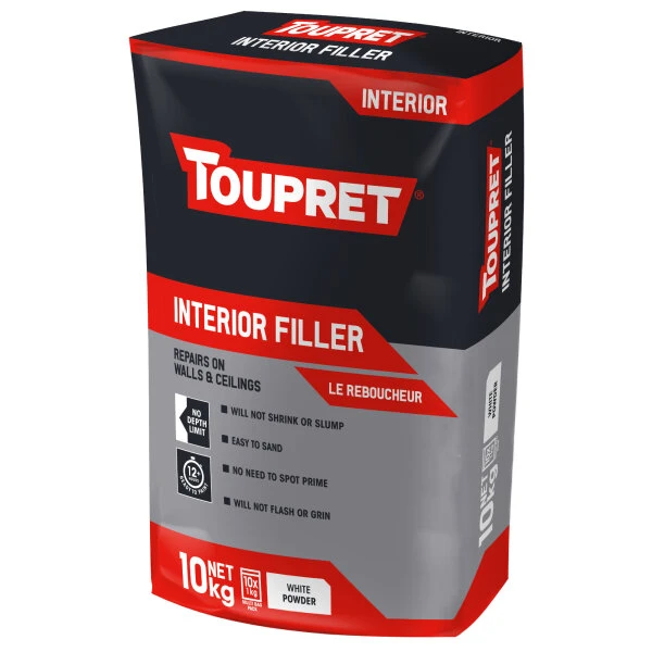 Toupret Interior Filler is an easy to sand, one coat filler. Toupret Interior Filler is ideal for repairs, gaps, cracks on walls and ceilings. Suitable for use on gypsum plaster, cement, concrete, breeze block, brick, stone, new or renovated paint and unpainted substrates. This product adheres to the surface and will not shrink, slump, flash or grin. It mixes easily in water. No priming required before overcoating. Working time is 30 to 40 minutes, second coat as soon as the filler is hard and dry to the touch. Overcoating: can be painted in 12 to 24 hours average time (after complete drying).