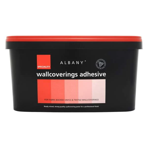 Albany Speciality Wallcoverings Adhesive is a strong, ready mixed product suitable for fabric backed vinyl’s and textured wallcoverings including; glass fabric, Wallrock, hessians, grasscloth, suedes, flocks, textiles, polystyrene veneers and polystyrene coving – as per manufacturer’s instructions. Coverage is approximately 1kg per roll.