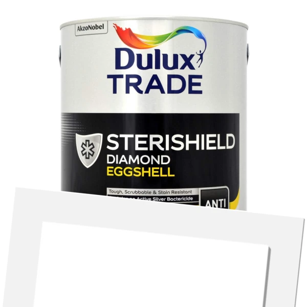 Dulux Trade Sterishield Diamond Eggshell is a scrubbable anti-bacterial coating for interior walls and ceilings. Helps inhibit bacteria, MRSA and E.coli when used alongside appropriate cleaning.Â