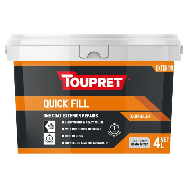 Toupret Touprelex is a fast drying, lightweight ready mixed filler for exterior use. The exterior filler is a resin rich, one coat filler that will not flash or grin and does not require overcoating with a stabilising solution. Toupret Touprelex dries to a light grey colour and can be overcoated after one hour. The times mentioned are indicative and depend on the substrate, coat thickness, and the ambient conditions. Â